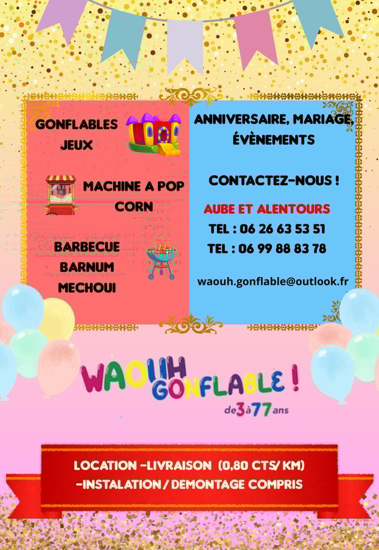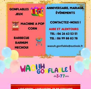 Waouh Gonflable, c’est d’abord un large choix de structures gonflables pour tous les âges, selon des thème différents (ambiance tropicale, univers clownesque, pirates, etc.), et de tout format(dimensions variables). Pour répondre à tous vos besoins, notre équipe veille à proposer un catalogue complet garantissant des produits de qualité et parfaitement sécurisés : des matériaux jusqu’aux designs (impressions réalisées par sublimation numérique), en passant par les couleurs, nous pouvons compter sur des fabricants partenaires qui garantissent des structures modernes, certifiées CE et respectueuses des normes européennes (exemples : EN14960, EN71-1, EN71-2, EN71-3…). Mais Waouh Gonflable, c’est bien plus que ça. C’est aussi une logistique maîtrisée qui nous permet d’assurer des locations et des livraisons efficaces dans l’Aube et dans les départements voisins : devis personnalisé, livraison rapide (entre 24h et 72h), mise en place et vérifications, SAV réactif, etc. Le petit plus : une prise en charge complète qui couvre toutes nos interventions (livraison (80 centimes le kilomètre), l’installation et le démontage compris). Et ceci, à des tarifs toujours abordables et cohérents. N’hésitez pas à nous demander le catalogue de nos structures gonflables dans l’Aube pour découvrir, en détail, nos activités destinées à tous les âges et à tous les événements.